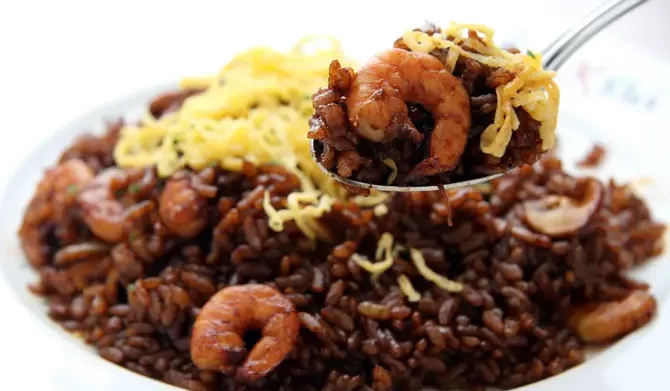 ●黒褐色をした珍しいご当地チャーハンだ。えびと玉ねぎをたっぷり入れたえびめしは、風味豊かで非常に美味しい。(60代/女性/専業主婦)