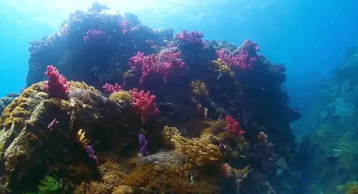 最後に、横島の水中景観を詳しくご紹介します。この特別保護区には一つの大きな特徴があり、硬質サンゴと軟質サンゴがここで共生していることです。この二種類のサンゴは生息環境が根本的に異なるため、自然界では共生するケースは極めて稀です。愛南町の海域はあらゆる生物が生息しやすい恵まれた自然環境に恵まれているため、この二種類のサンゴが共生できるのです。